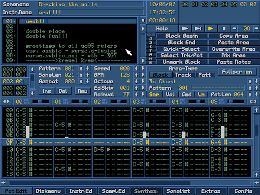 A MOD tracker was a DOS-based sequencer and sampler. On the screen, it looked like a spreadsheet type grid that moved from the bottom of the screen to the top at a BPM (speed) you selected. As it moved the play bar, samples (sounds) would activate, like a player piano. These samples were programmed on the grid at frequencies (notes) that the musician selected using the computer’s keyboard, thus making music. MOD tracking software was a staple in the studio from 1996-2000. Most of my early albums were entirely programmed in MS-DOS.